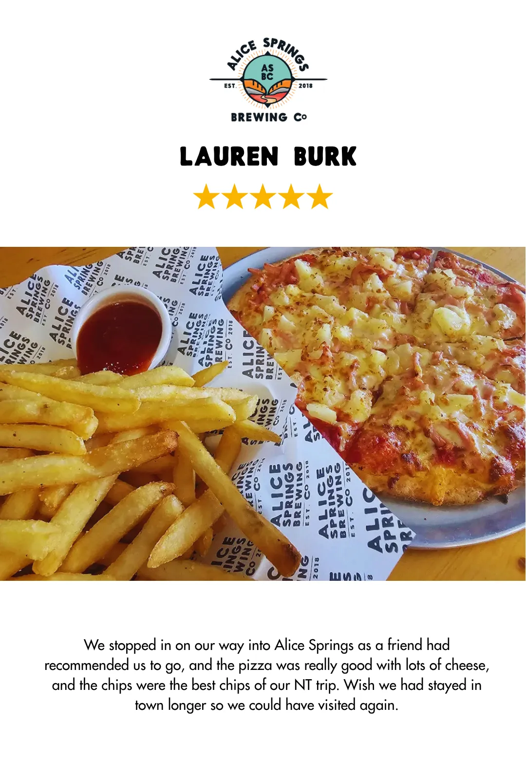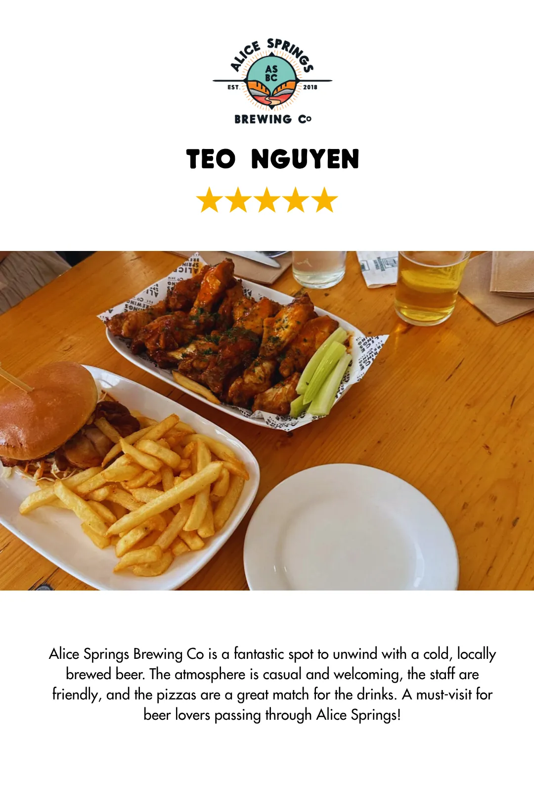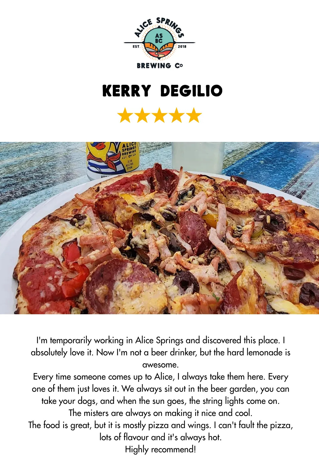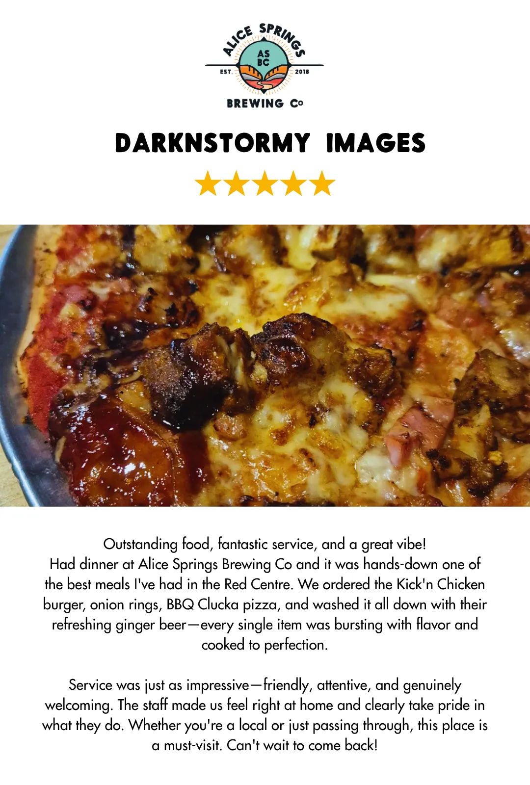 We make the beer here. That’s kind of the whole point. These are all brewed with this place in mind — the heat, the dry air, and that feeling when you’re ready for something cold. There’s a mix on tap — easy drinking ales, something a bit darker, and a few rotating options — all poured fresh and kept just how it should be. And with food like this? It just works. Pizza, wings, burgers… then a fresh pint poured right here on-site. Hard to beat that.